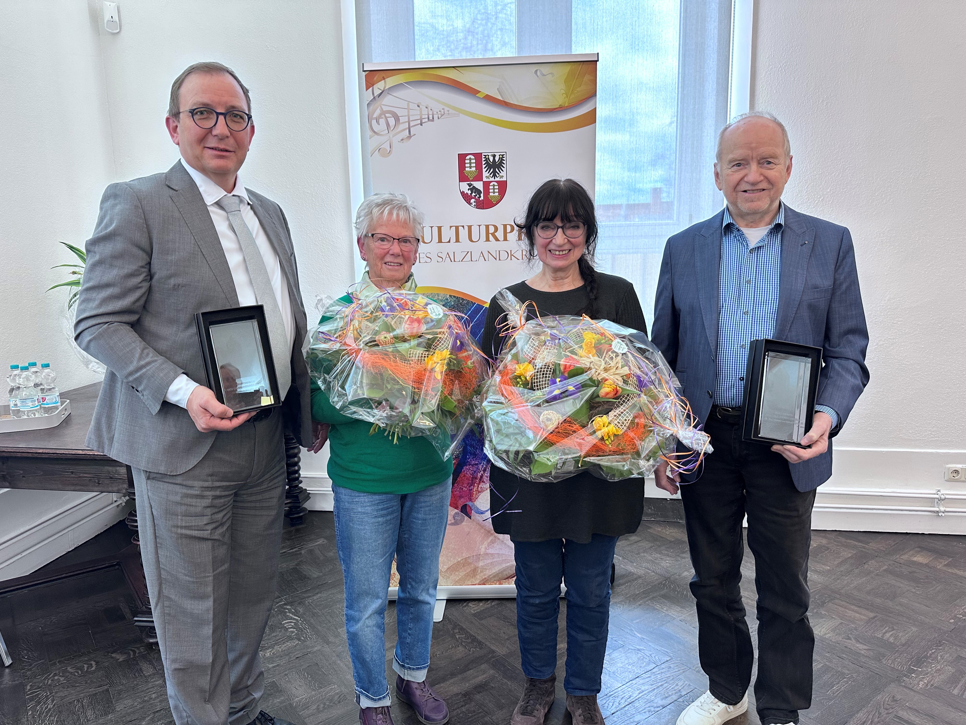 Landrat Markus Bauer ehrte Heidemarie Wagner aus Freckleben, Bärbel und Wolf-Michael Feldbach (v.l.) in Schönebeck für ihr Engagement im kulturellen Bereich im Salzlandkreis.